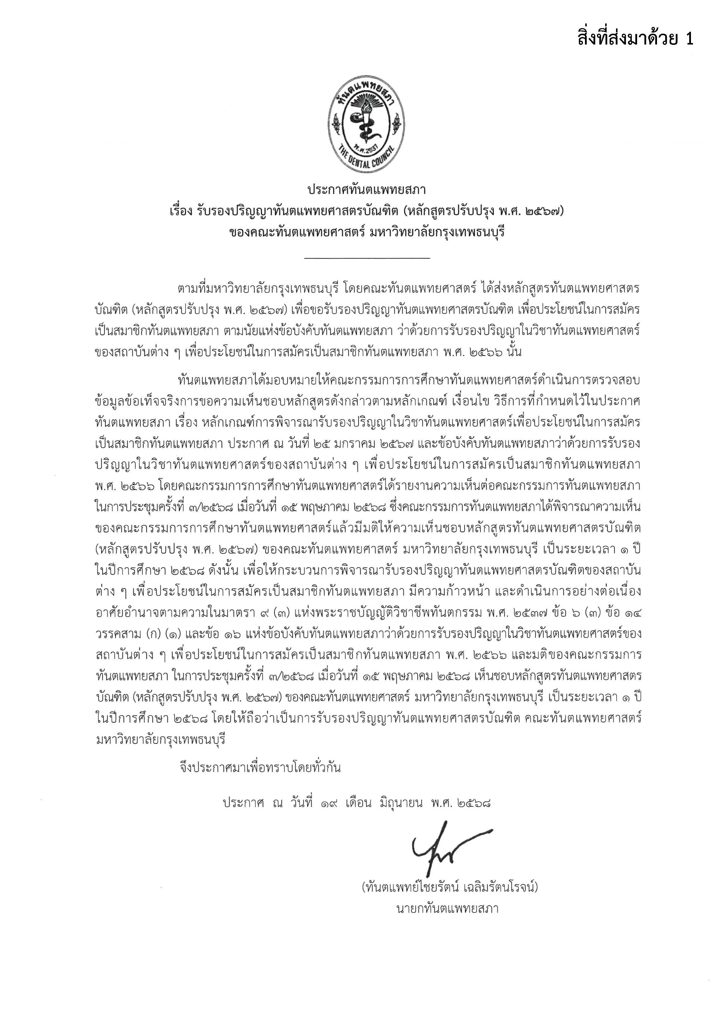ทันตแพทยสภา ได้ทำการรับรองคณะทันตแพทยศาสตร์ มหาวิทยาลัยกรุงเทพธนบุรี และเห็นชอบหลักสูตรทันตแพทยศาสตรบัณฑิต ในวันที่ 18 มิถุนายน 2567